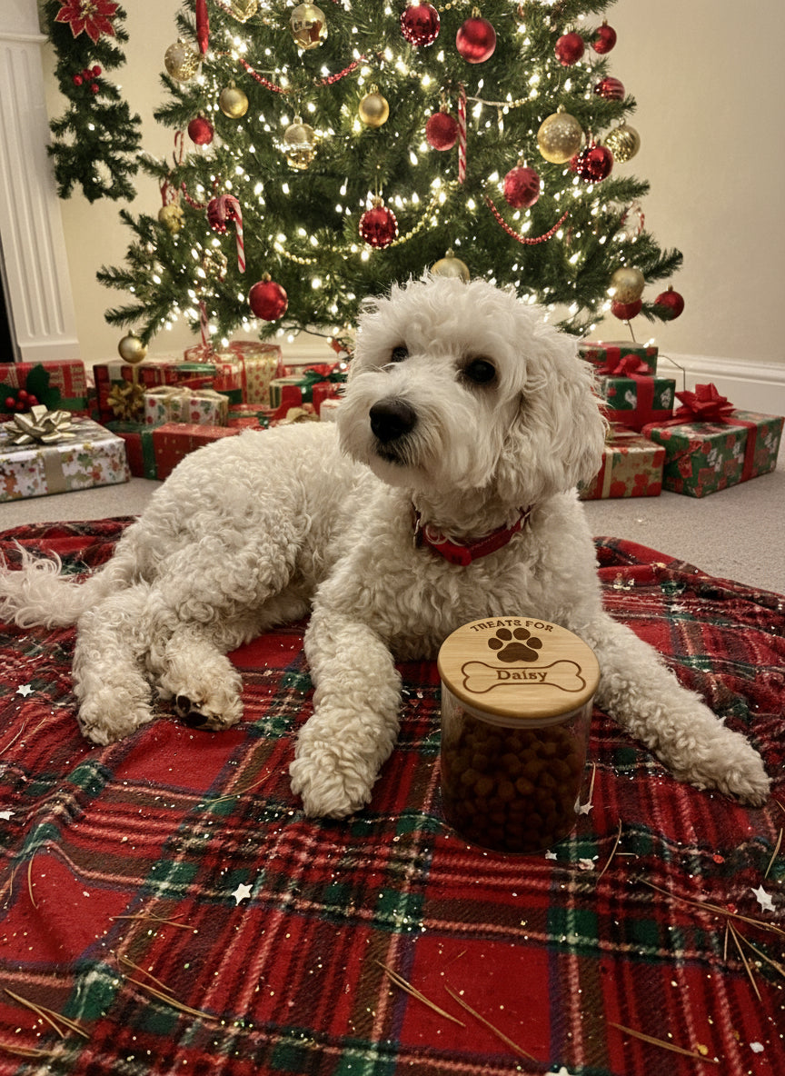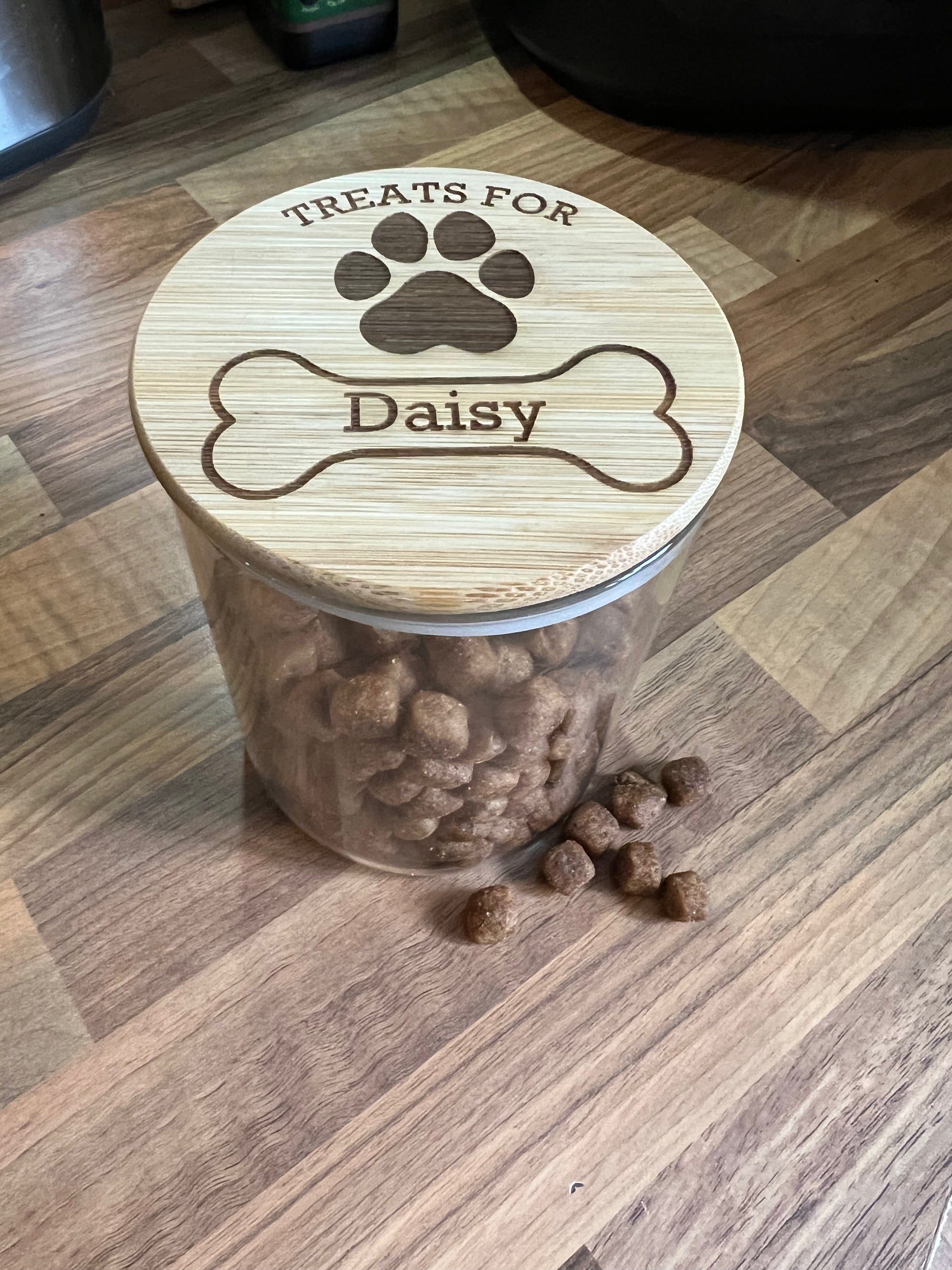 Dog treats jar personalised with name. engraved. pet treats storage jar, can be custom made to any words 1litre. Airtight bamboo lid.