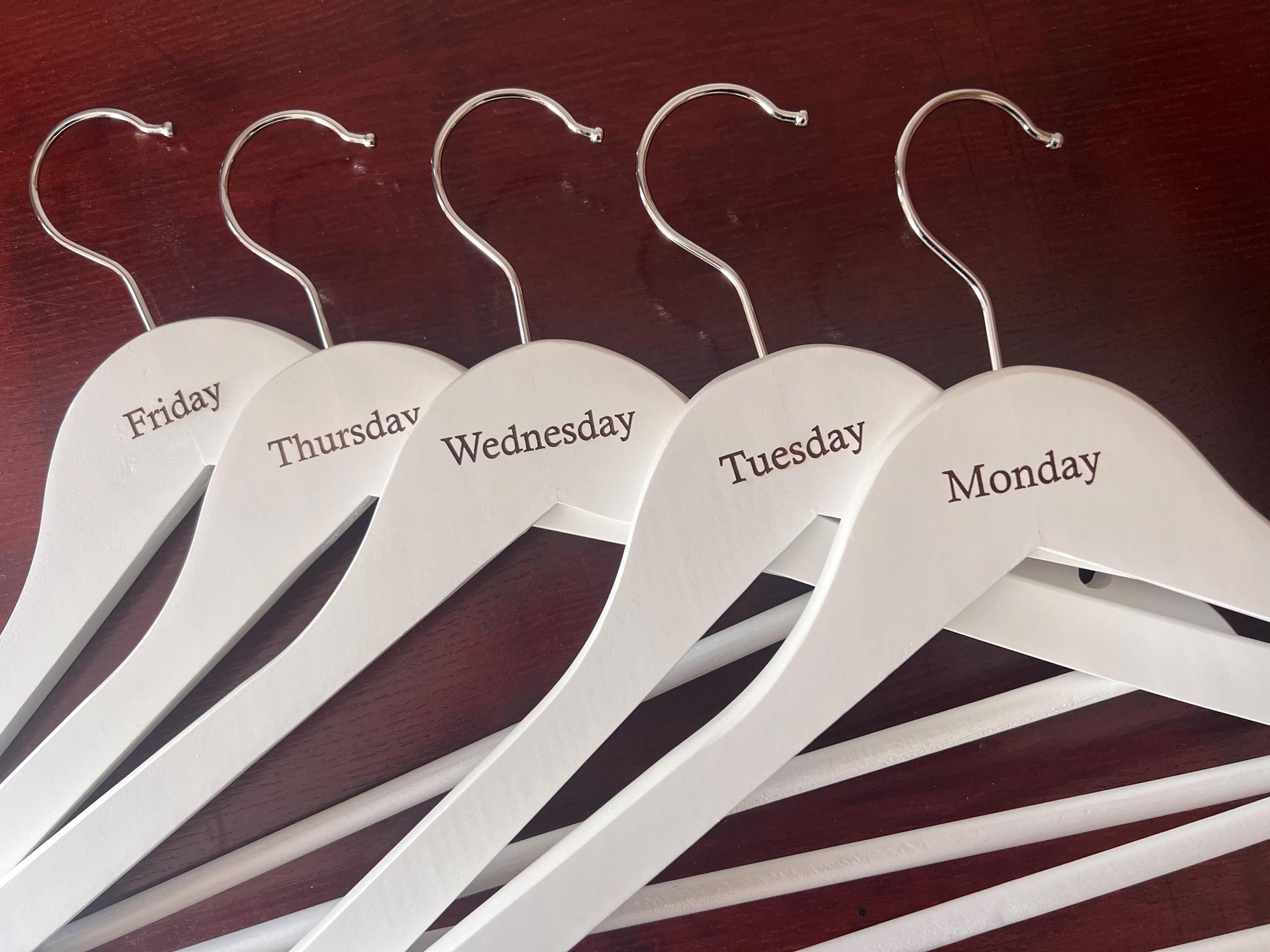 Week day engraved wooden white hangers. With name and day of the week or simply the day of the week.